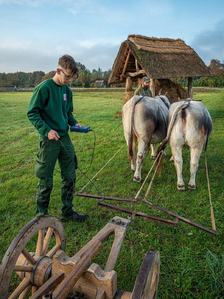 Auf dem Gelände des Freilichtlabors präsentieren mehrere Pferde- und Rindergespanne den historischen Ackerbau. Die wissenschaftlich untersuchten Wölbäcker werden unter realistischen Bedingungen gepflügt und geeggt. Zudem kann live die Herstellung eines Ochsenjochs verfolgt werden. Pflugexperte Thomas Lang gibt spannende Einblicke in die technische Entwicklung von Pflügen von der Eisenzeit bis in die Moderne. Die jungen Gäste können sich wieder auf eine Fahrt im Wagen mit Ziegengespann freuen, das spielerisch die Bedeutung tierischer Zugkraft in der historischen Landwirtschaft vermittelt.