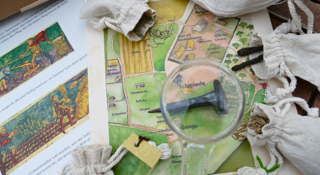 Mit der Entdeckerkiste erfährt man viel Wissenswertes über das Leben zu Zeiten Karls des Großen. Von Station zu Station erforscht man gemeinsam den Herrenhof und findet heraus, wie der Alltag vor 1200 Jahren funktioniert hat. Jedes Familienmitglied – egal ob klein, mittelgroß oder erwachsen – trägt einen Teil dazu bei. Genaues Beobachten und geschicktes Ausprobieren sind die Voraussetzung für diese Reise ins frühe Mittelalter.