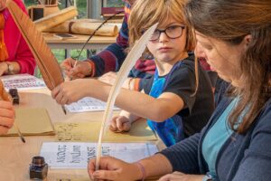 „Brettchen“ mit vier Löchern spielen in diesem Workshop die Hauptrolle. Durch jedes Loch wird ein Faden geführt. Ist die Kette aufgespannt, wird der Schussfaden durch das Fach gelegt und die Brettchen können gedreht werden. Aber, gewusst wie! Die Leute damals kannten als Profis alle Möglichkeiten, um Farben- und Formenmuster zu entwerfen. Sogar Buchstaben konnte man weben. Als Anfänger:innen begnügen wir uns mit einem einfachen Muster.